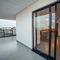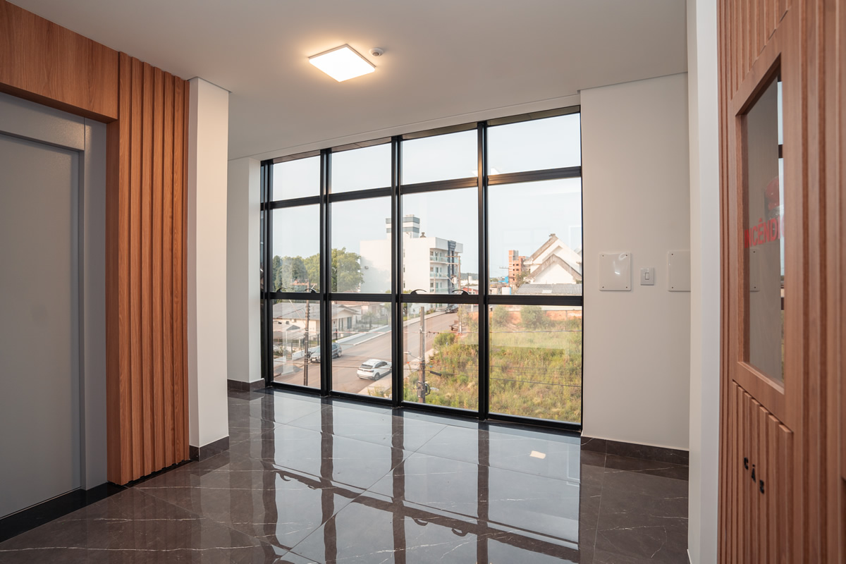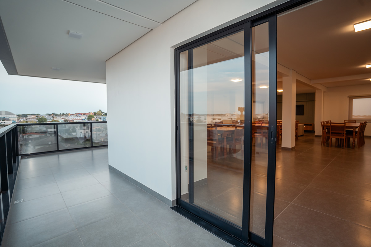 Sacadas em vidro espelhado e esquadrias de alumínio preto na linha Gold (permite o fechamento da sacada).