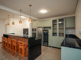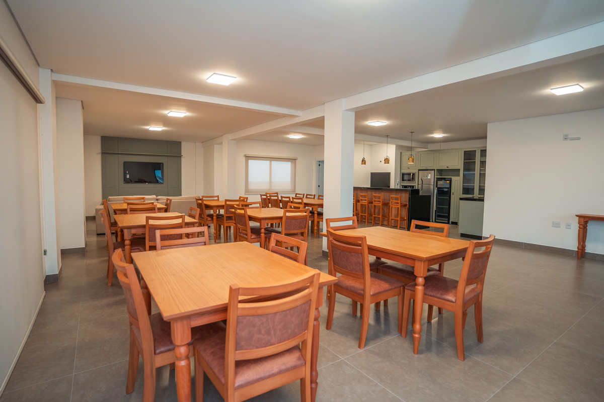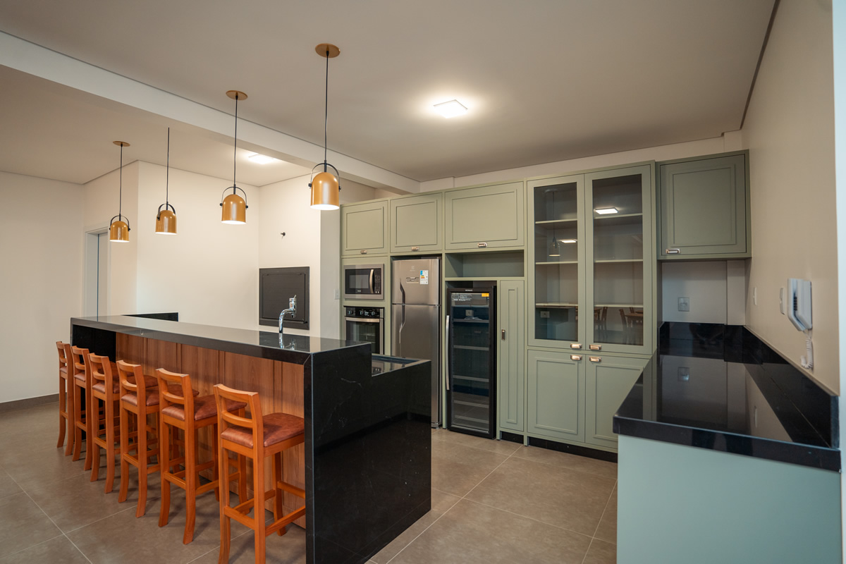 Salão de festas moderno, amplo, mobiliado e com utensílios domésticos.